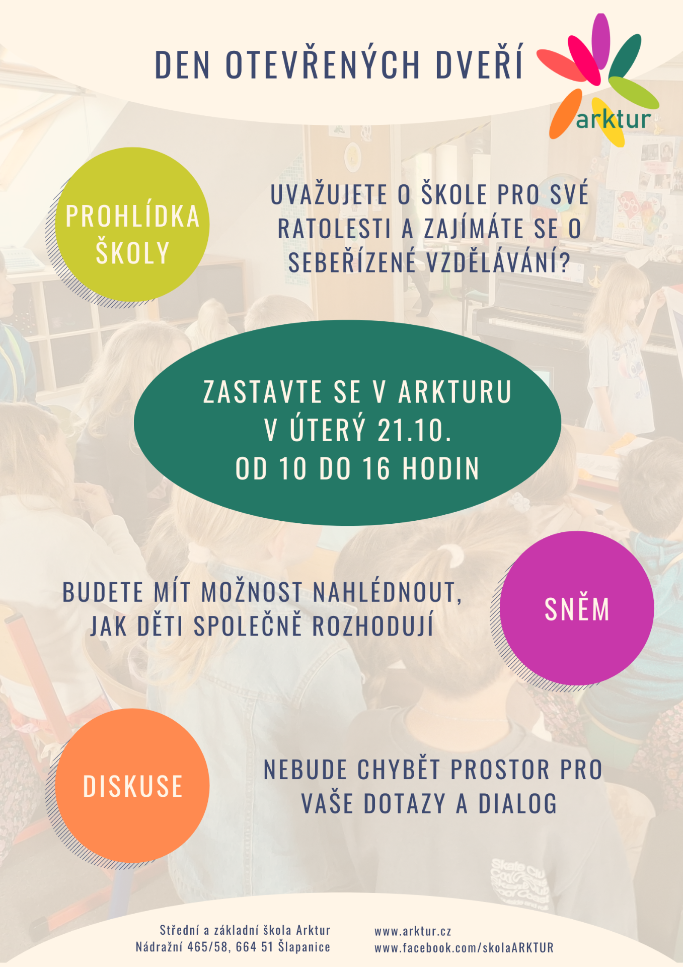 Zveme vás na Den otevřených dveří, který se koná 21. 10. 2025 od 10:00 do 16:00 hodin na SŠ a ZŠ Arktur ve Šlapanicích na Nádražní ulici 58. Aby vám neunikly žádné informace, mrkněte na příspěvek na Facebooku.
